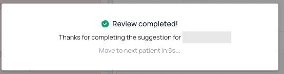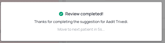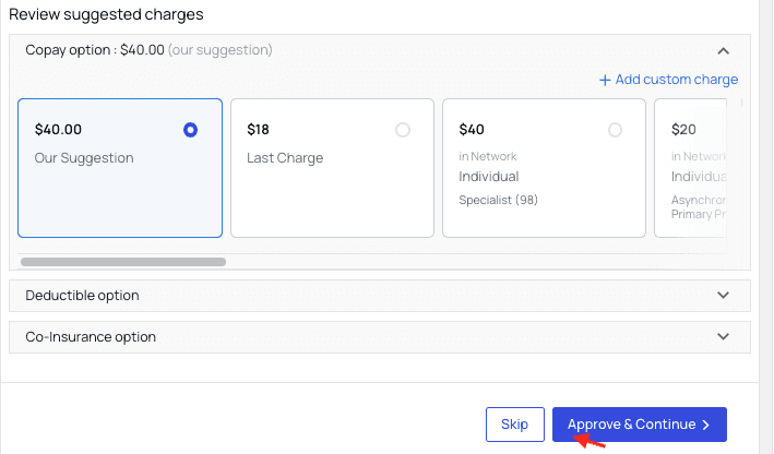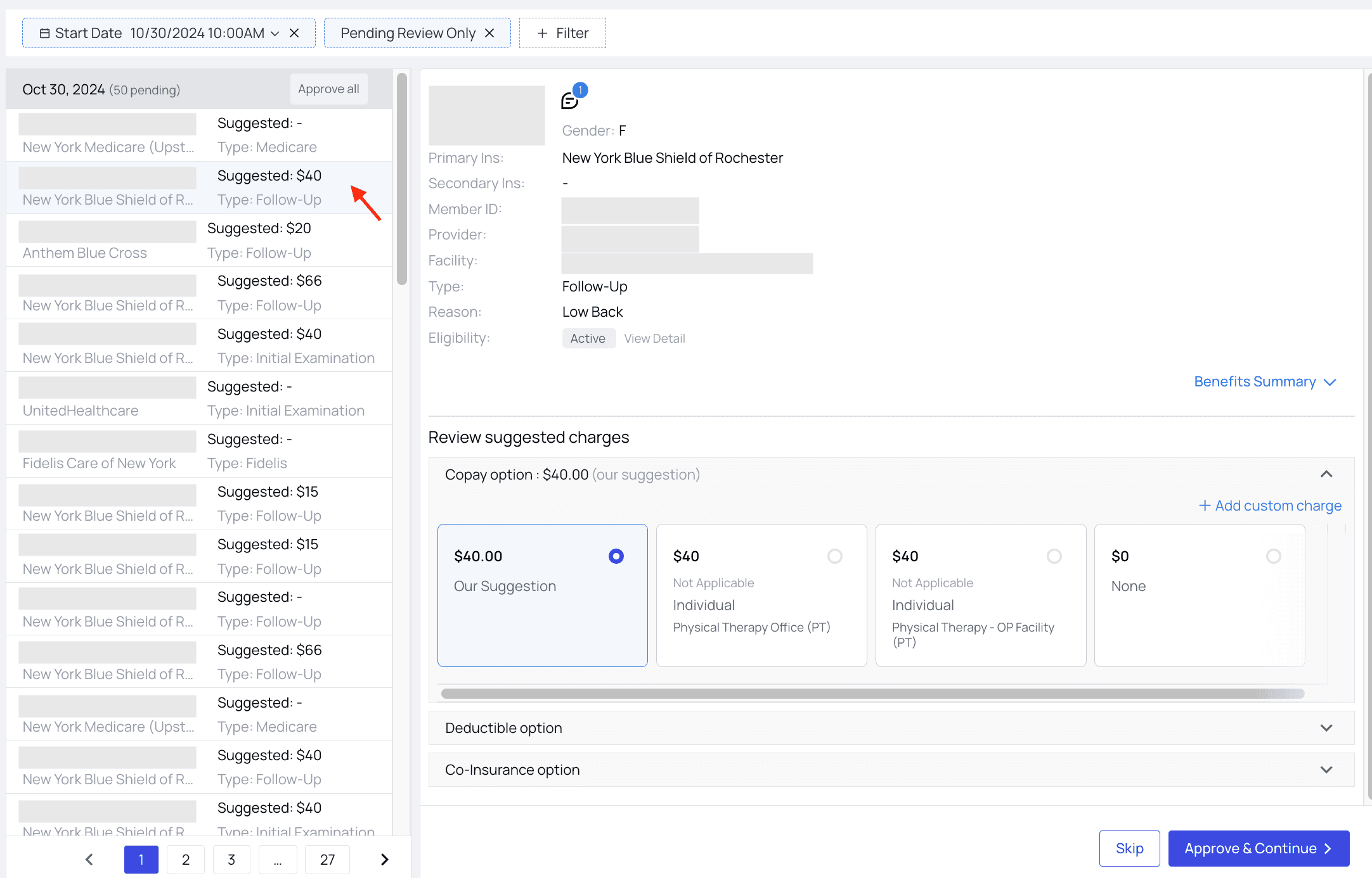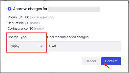 Of course, we recommend using the pre-selected option labeled ‘Our Suggestion,’ so for this example we’ll continue with the suggested copay amount. Click Approve & Continue. A confirmation popup will appear. We’ll select charge type ‘Copay’ and then click Confirm. A message indicating review completion will appear, and you can move on to the next patient.