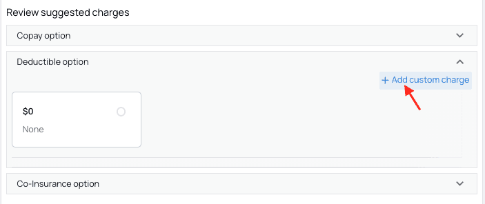 • 💰 Add a Custom ChargeIf none of the charge options work for your purposes, you can choose to Add custom charge instead. For this example, we’ll create a custom deductible charge, though the process is the same for all types of charges.First, click on Add custom charge.