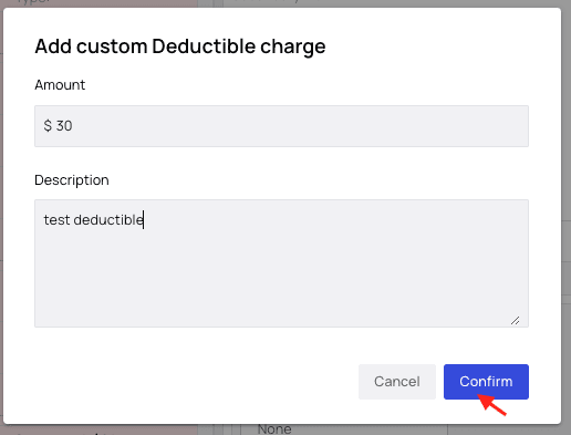 Fill in the amount and the description, then click Confirm. Your custom charge will appear in the list of options. Select it, then click Approve & Continue. In the popup, select charge type ‘Deductible’ and then Confirm. A message will appear, informing you that the review has been completed.