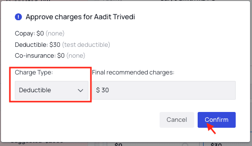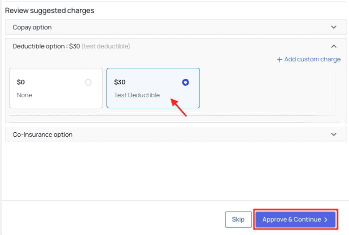 If you would like to be able to charge for multiple choices simultaneously (such as Copay and Deductible), your account manager can help set up that feature. To approve charges in bulk, use the Approve all button, described earlier in this guide.