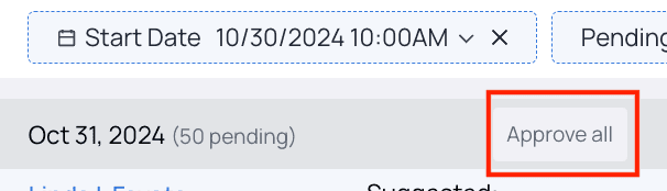 • **Approve all**** button**You’ll see this button in each gray highlighted start-date row.❗Note: Each page shows up to 50 encounters with charges to review, but if there are more than 50 encounters on a date, the rest will spill over into the next page. The **Approve all** button approves all charges for that date.