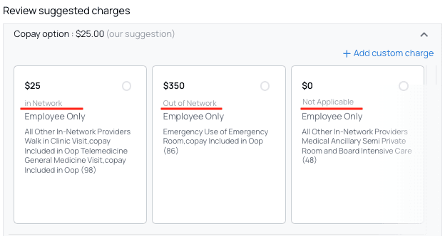 Insights gathers all available charge information from the payer and surfaces it in the list of charges. This means that you’ll have choices beyond the Athelas suggested charge, as well as more context and detail about each charge option, when the payer provides such information.