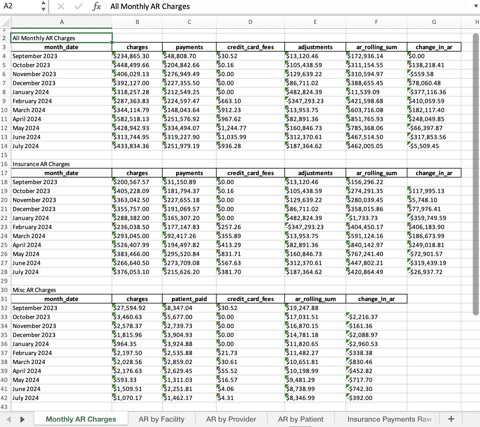 The first tab, Monthly A/R Charges, is essentially a summary page. The first of the five sections is labeled ‘All Monthly A/R Charges.’ It is the sum total of the other four: Insurance, Miscellaneous, Appointment, and Self-Pay charges. Insurance encompasses all external payers. Miscellaneous, Appointment, and Self-Pay charges are all patient responsibility. Note that this first tab will be unaffected by any date filters you may have set. The subsequent tabs, however, will reflect your date range parameters.