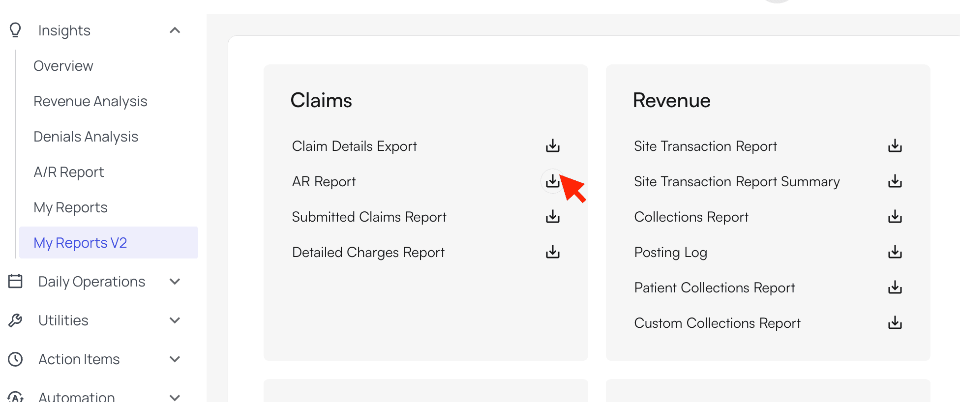 First, click the download icon for the A/R Report on the My Reports page. Set all filters (scroll down in the window to find them, as there are many) and click Download. Open the downloaded CSV file that in Excel or a similar program. You will see A/R divided into four categories on the first tab, with about ten more tabs of data available at the bottom, depending on the filters you set.