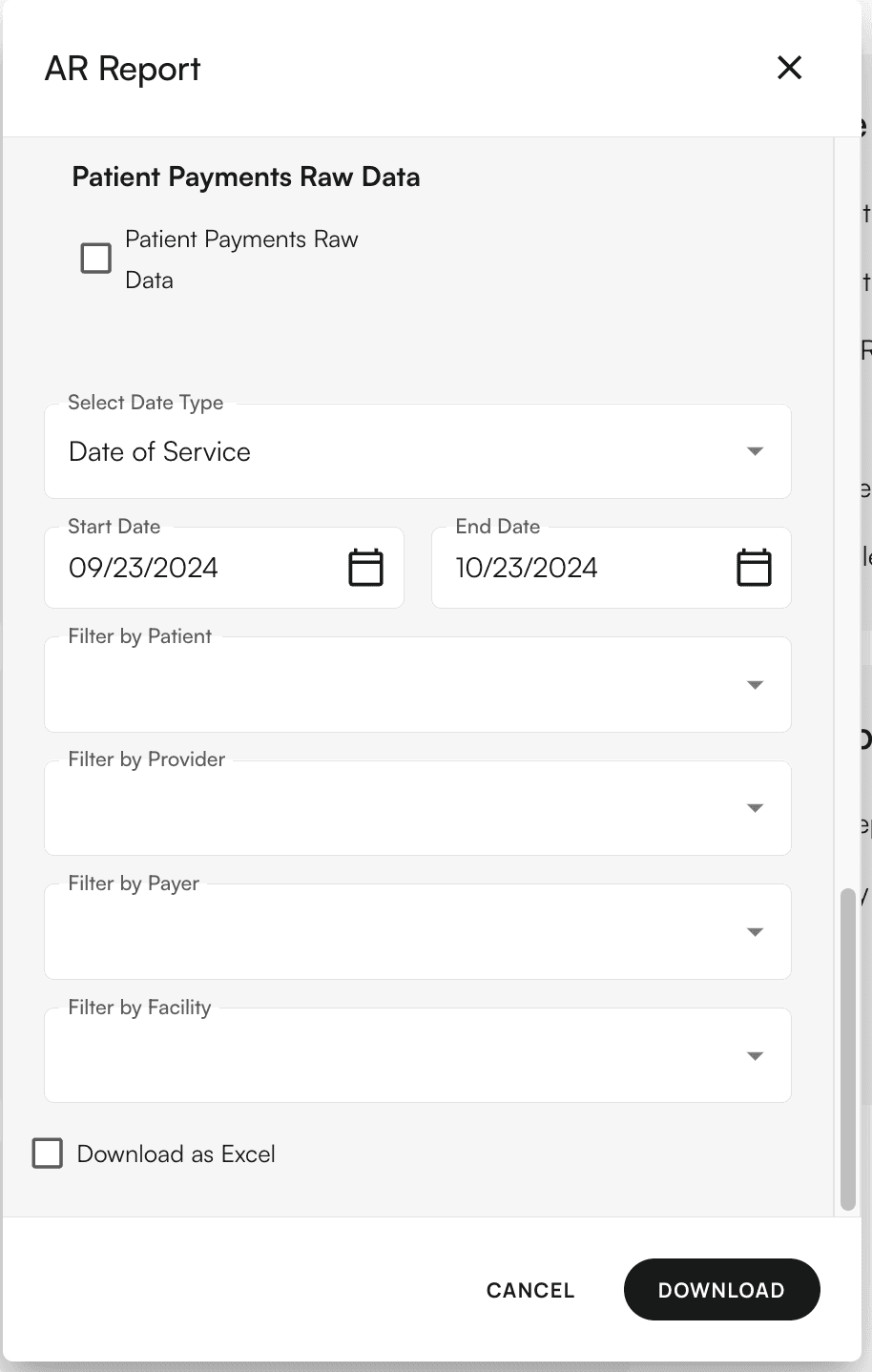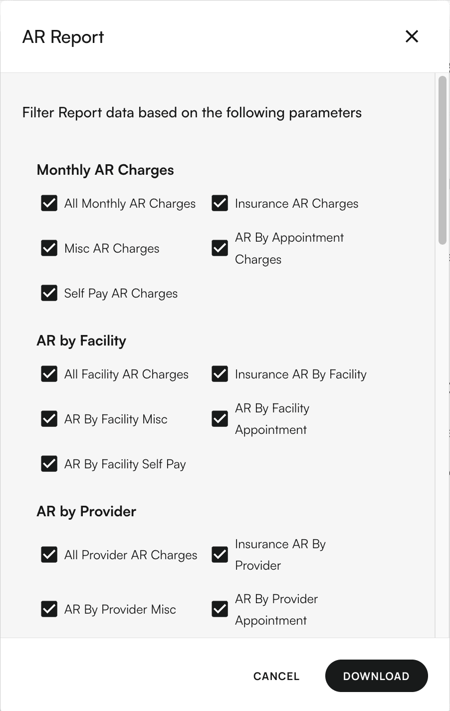 This comprehensive report includes primary/secondary insurance A/R, as well as patient A/R data. If this report does not meet your needs, please contact our staff. A/R is calculated as follows: A/R = Charges - Insurance Payments - Patient Payments - Insurance Adjustments. ❗ A/R Reports are generally very large and will take time to download.