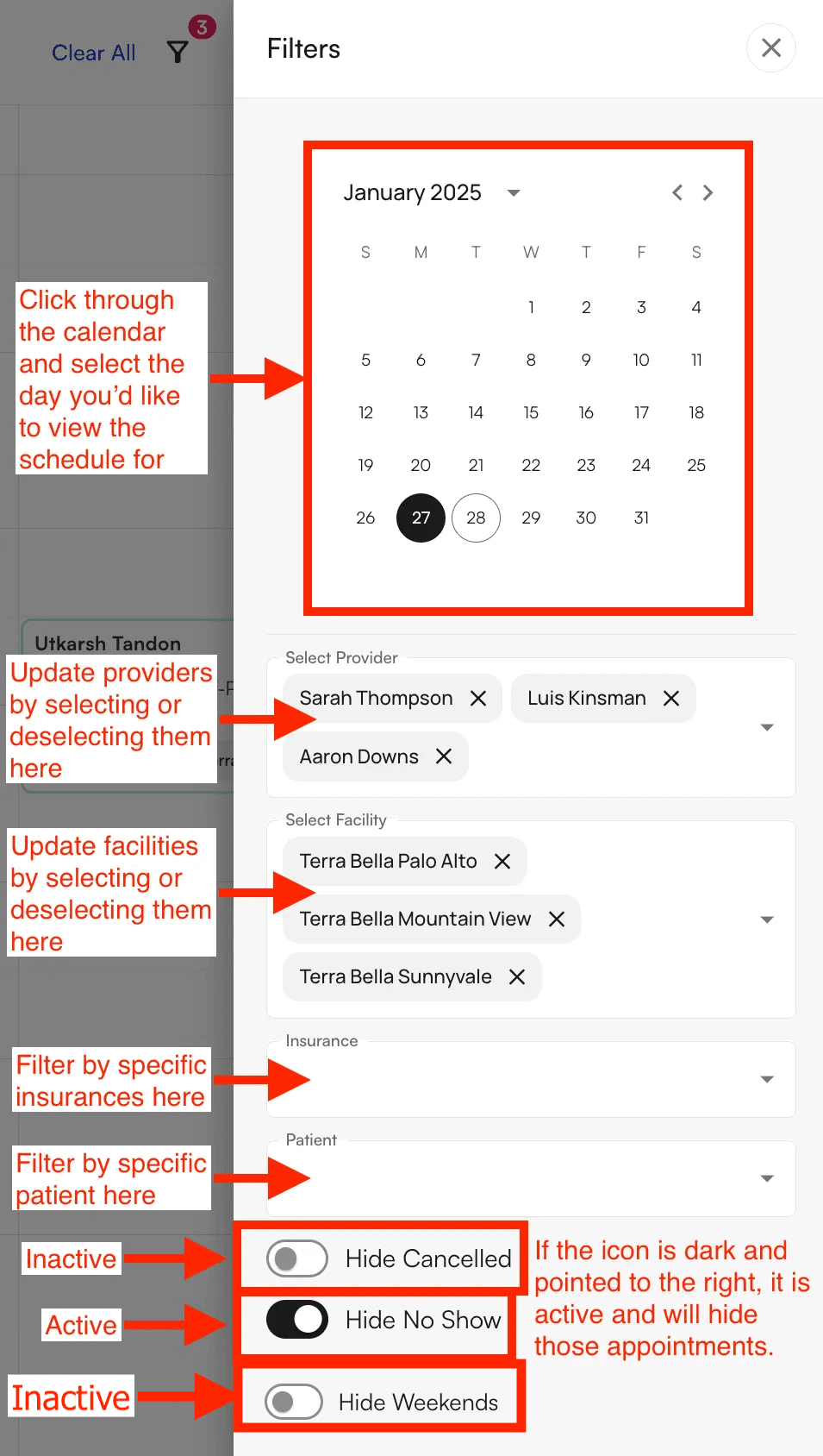 **Filtering by provider **allows you decide which providers you do and don’t want to see on your calendar. When more than once provider is selected, each provider is displayed as a column on the calendar view. **Filtering by facility **allows you to pick facilities you do and don’t want to see in the calendar view. When more than one facility is selected, each will appear as a tab along the top of the calendar view. **Filtering by Insurance **shows only appointments with patients whose insurance provider matches your selection. Filtering by Patient shows only appointment with specific patients you select. Filtering out cancelations will hide appointments that have the “Cancelled” status. Filtering out “No Shows” will hide all appointments that have the “No Show” status. Filtering out weekends will hide Saturdays and Sundays from your calendar view. This will be applied to all of the 1 day, week, and month views. All filters can be cleared at once by clicking the “Clear All” at the top of the calendar.