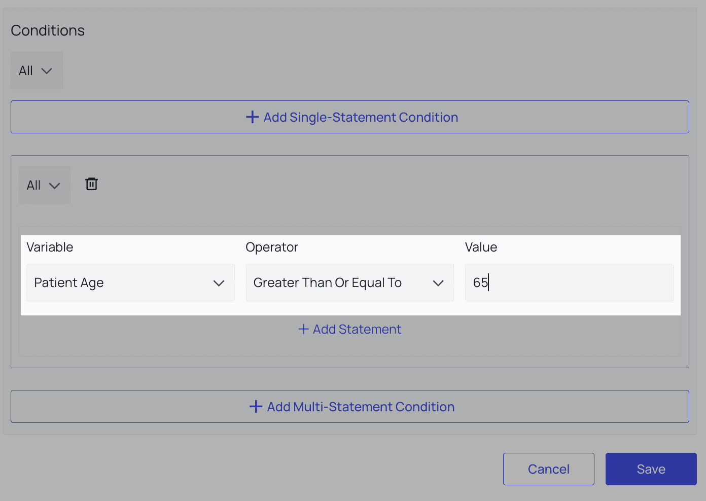 Under Variable, choose ‘Patient Age’ and set it greater than or equal to 65.