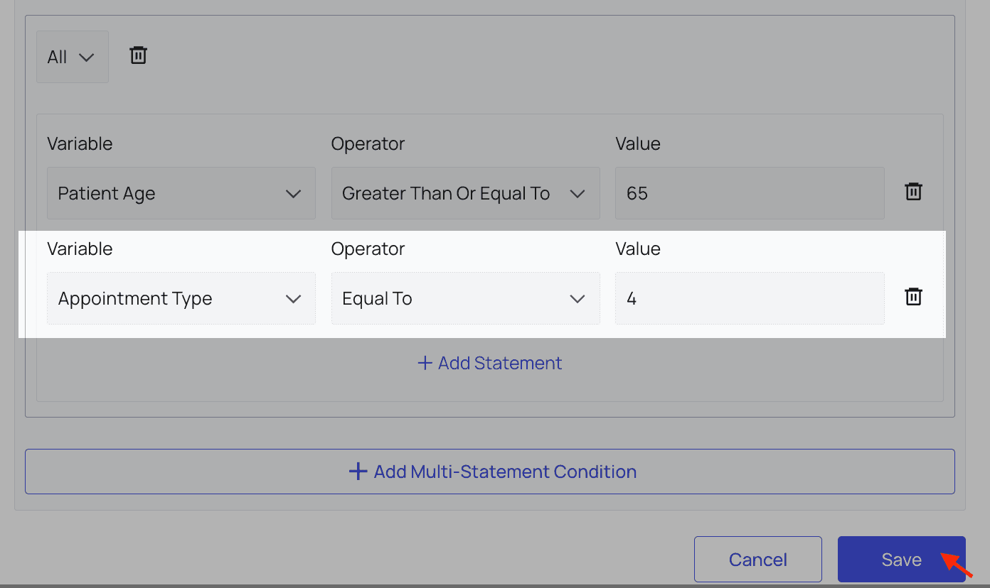 Condition Type, in this case, you may choose ‘All’ or ‘Any,’ as we will use a multi-statement condition anyway. If you need to edit the rule later, you can change whether ‘All’ conditions must be met or if only ‘Any’ conditions must be met to activate the rule.