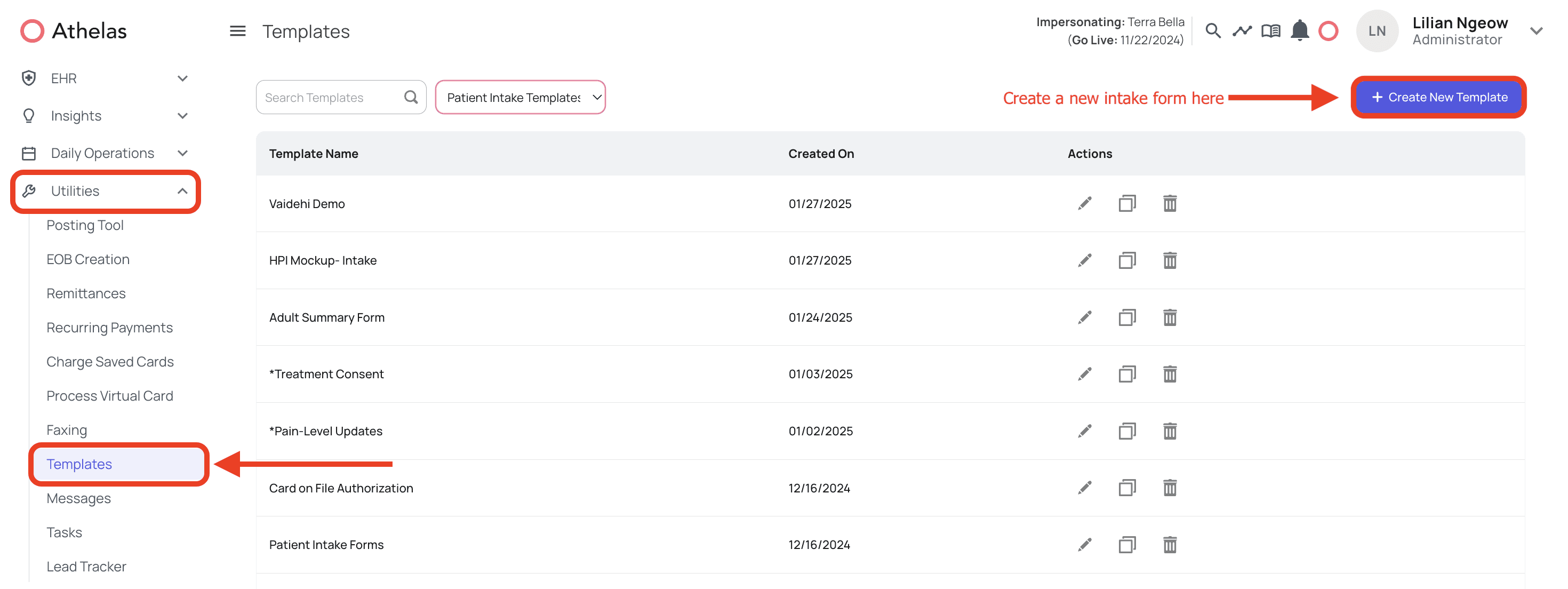 This video illustrates the following: Intake forms can be configured directly within Air itself. Navigate to the menu bar on the left hand side and click on the Templates section under Utilities. To create a new intake form, click on + Create New Template on the right hand corner. When you create on the button, you’ll be routed to a new page where you’ll be able to create your custom intake form.