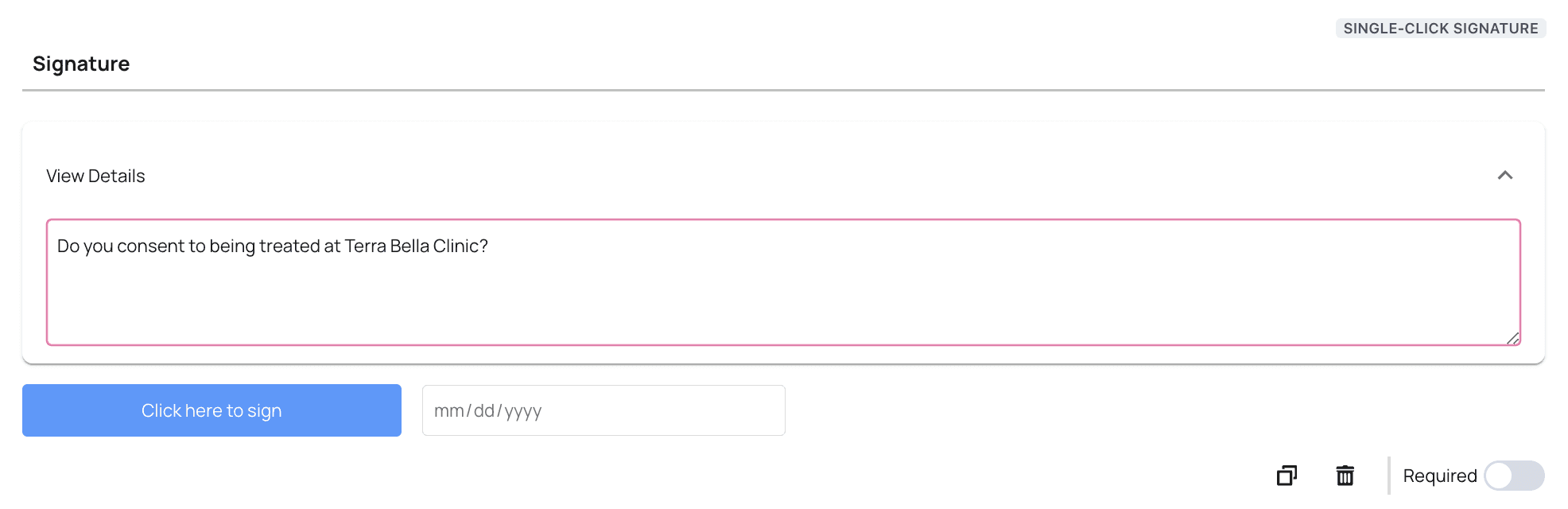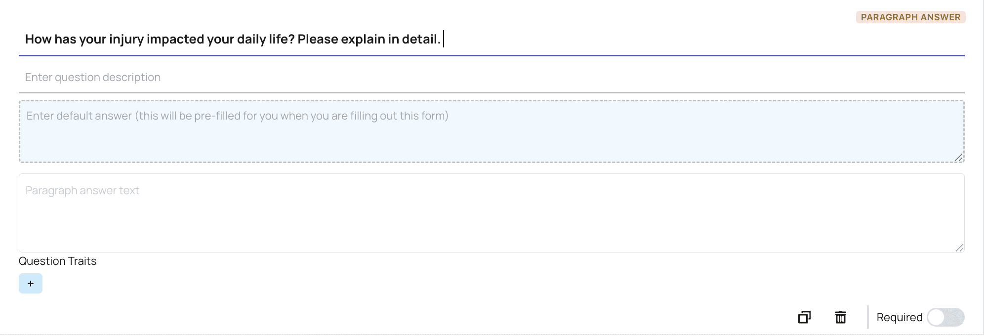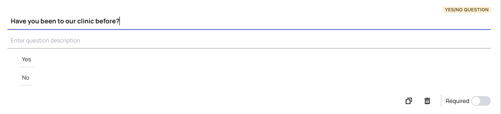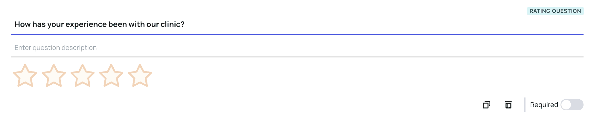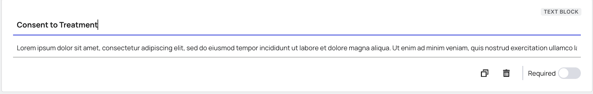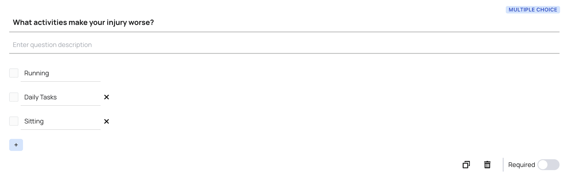 Components are what you will be using to create your desired intake form. Drag and drop the components from the left to the right to add intake form fields. The different components available to you are: Single Choice: Ask a question where only a single choice can be chosen as the answer. Click the + to make a new option. Multiple Choice: Ask a question where multiple options can be chosen as the answer. Click the + to make a new option. Yes/No Question: Ask a question where only yes or no can be chosen as the answer Rating Question: Ask a question where a rating from 1-5 is determined as the answer Date Question: Ask a question where only a date can be inputted as the answer Text Box: Convey text that doesn’t require patient action Short Answer: Ask a question where a short answer can be typed in, this is intended for short responses Paragraph Answer: Ask a question where a paragraph answer can be typed in, this is intended for long responses Number Answer: Ask a question where only a number can be inputted as the answer Table Answer: Ask a question in a table format. Each line creates a new column, click the + button to create a new one Signature Block: Create a section for the patient to sign their name, the date of signature will automatically populate. Each component can also be marked as a required field for the patient, or deleted/duplicated. The type of component will also be indicated in the top right corner.