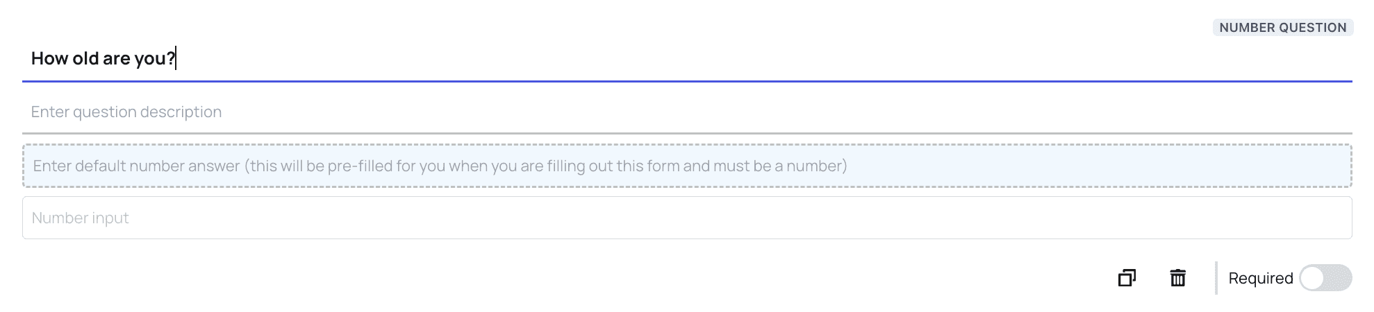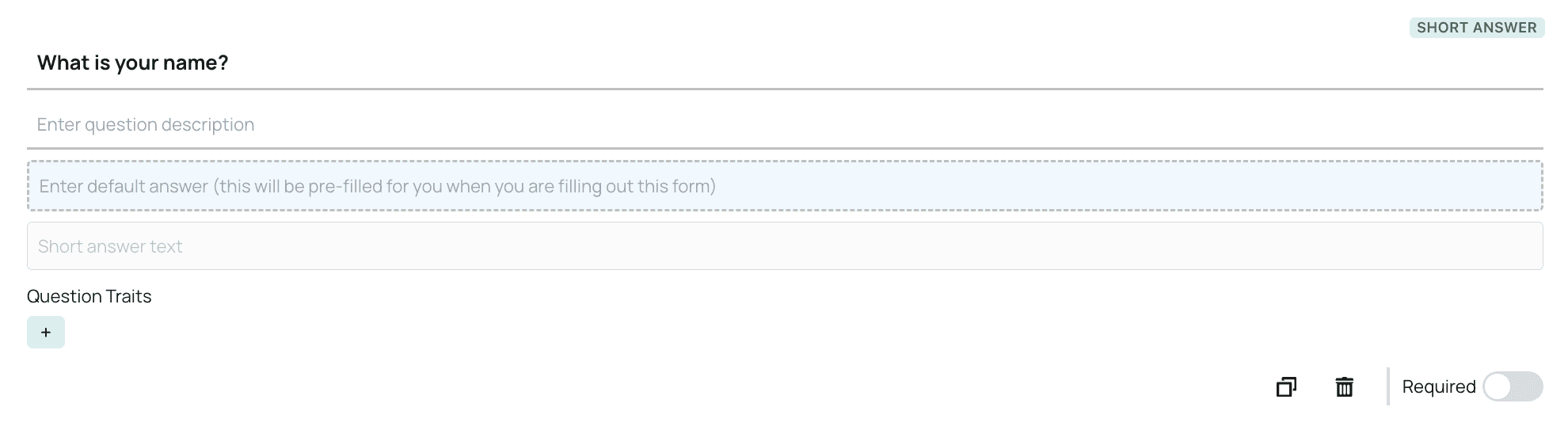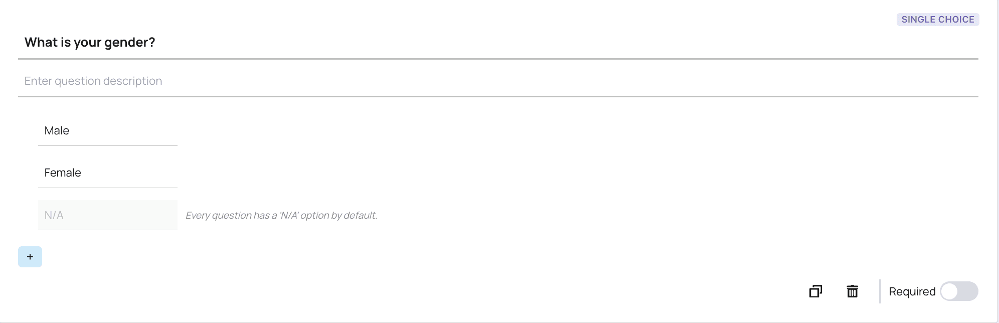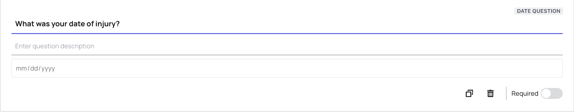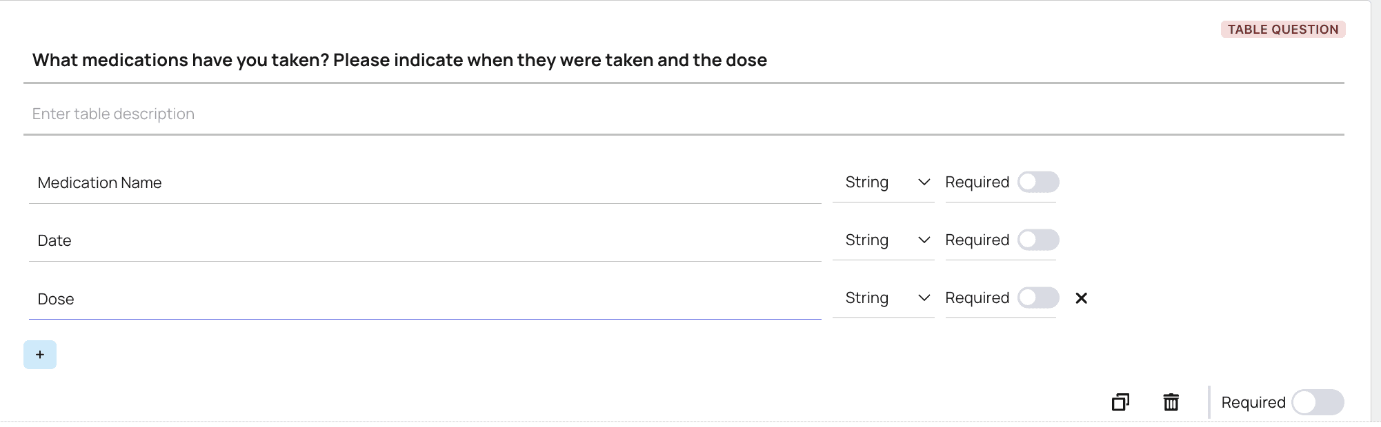 Components are what you will be using to create your desired intake form. Drag and drop the components from the left to the right to add intake form fields. The different components available to you are: Single Choice: Ask a question where only a single choice can be chosen as the answer. Click the + to make a new option. Multiple Choice: Ask a question where multiple options can be chosen as the answer. Click the + to make a new option. Yes/No Question: Ask a question where only yes or no can be chosen as the answer Rating Question: Ask a question where a rating from 1-5 is determined as the answer Date Question: Ask a question where only a date can be inputted as the answer Text Box: Convey text that doesn’t require patient action Short Answer: Ask a question where a short answer can be typed in, this is intended for short responses Paragraph Answer: Ask a question where a paragraph answer can be typed in, this is intended for long responses Number Answer: Ask a question where only a number can be inputted as the answer Table Answer: Ask a question in a table format. Each line creates a new column, click the + button to create a new one Signature Block: Create a section for the patient to sign their name, the date of signature will automatically populate. Each component can also be marked as a required field for the patient, or deleted/duplicated. The type of component will also be indicated in the top right corner.