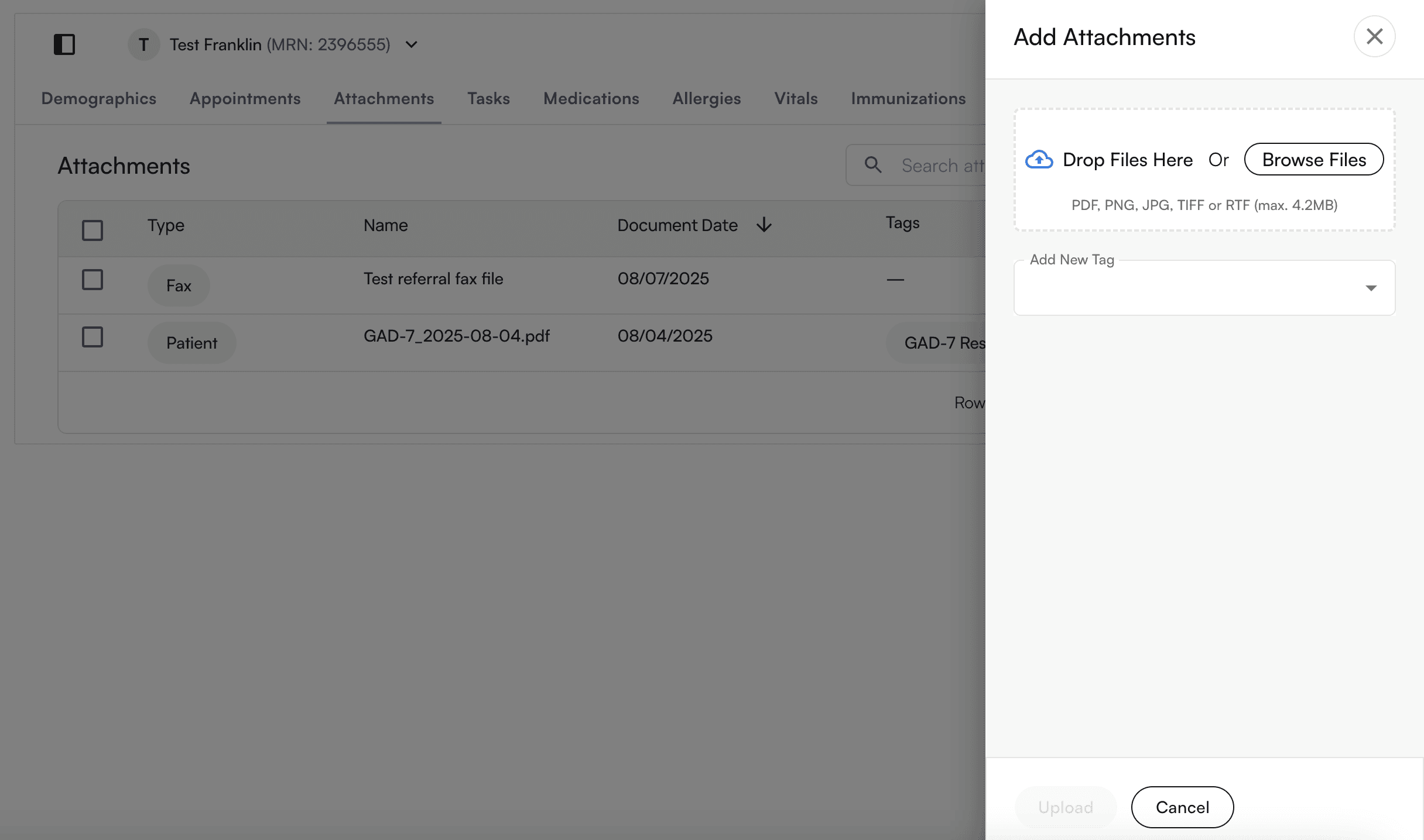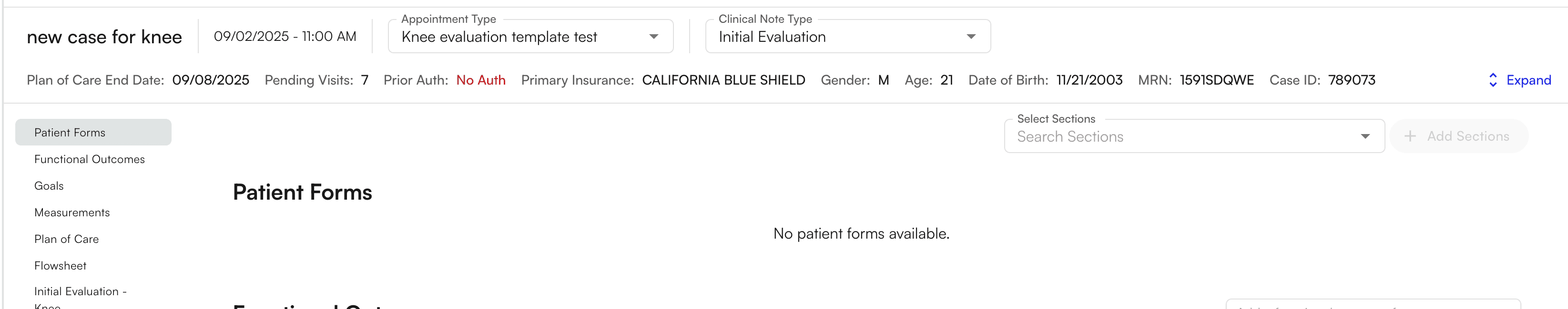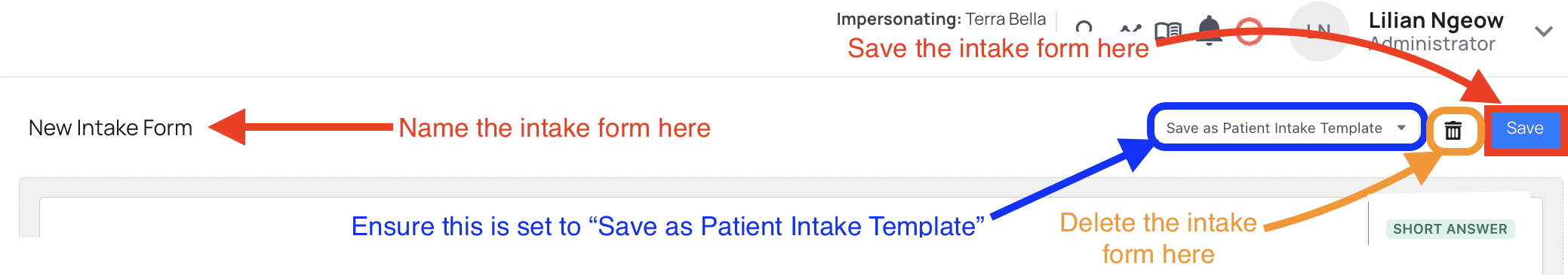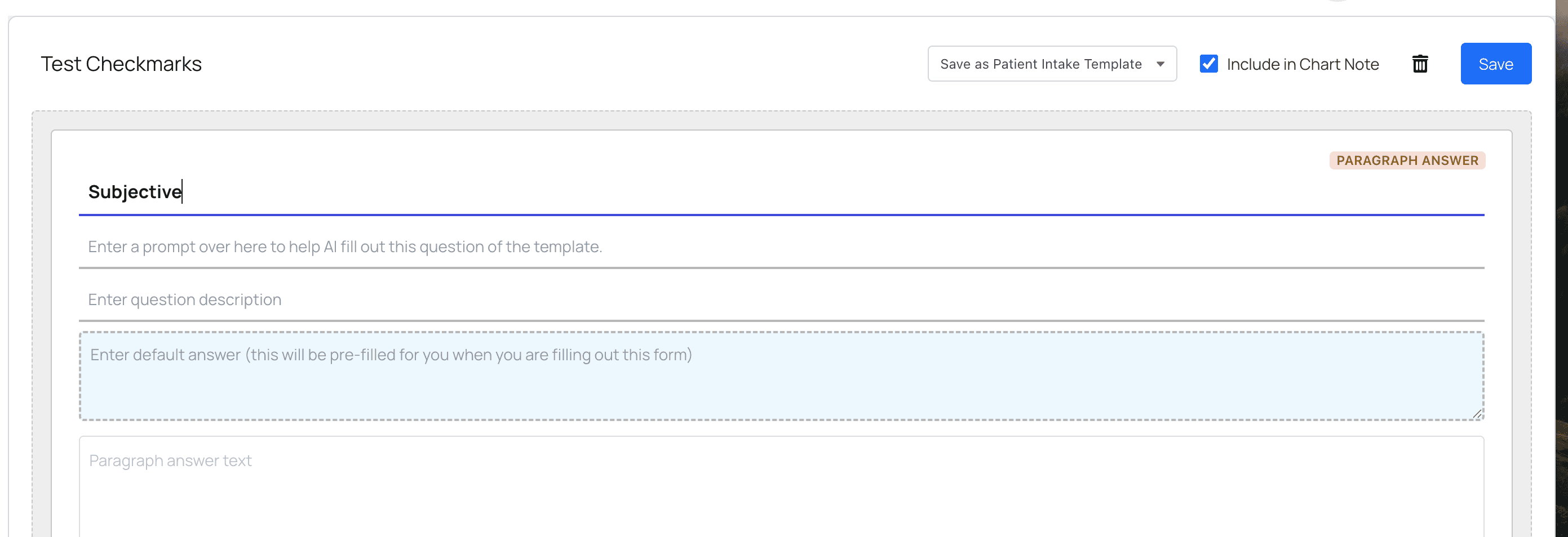 Once you’ve created your intake form using the components, you can then name your intake form and save it. Please ensure that you’re selecting the option *Save as Patient Intake Template *to save it as a patient intake form. The option to delete the form is available as well. For simplicity, this image states all the different actions you can perform within this page: Once a practice receives the intake form, you can attach to the patient’s chart note directly here: You can now also configure intake forms to be included in the chart note. When checked “Include in Chart Note”, the Patient Forms will appear in the Chart Note here: