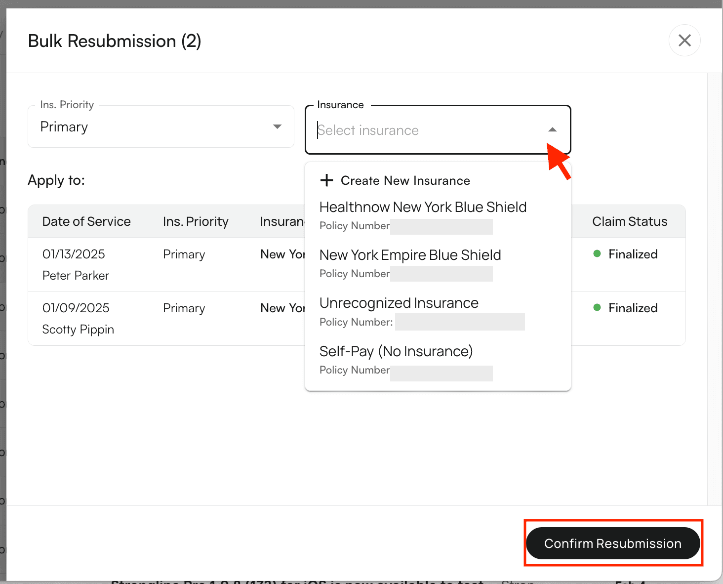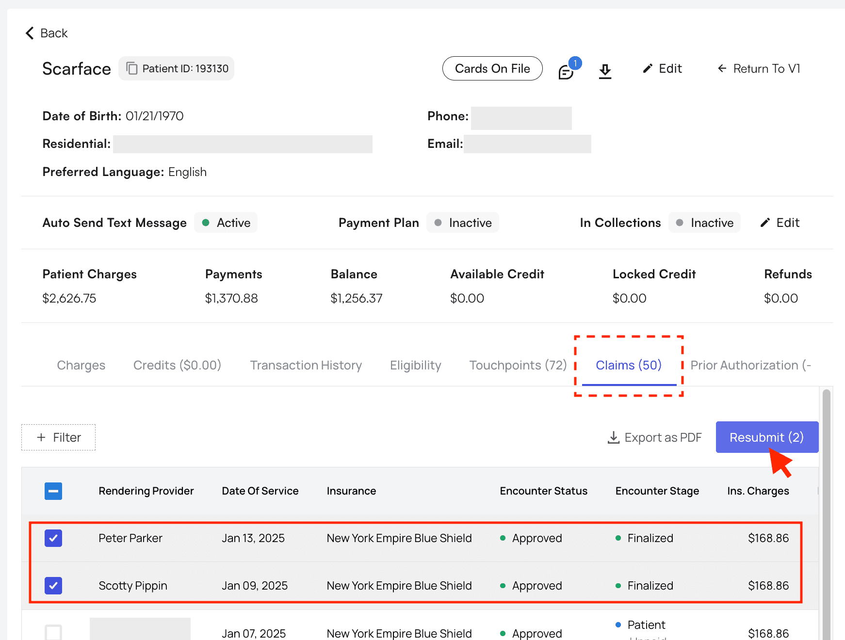 You can then check the boxes for the claims you’d like to resubmit, then click Resubmit.