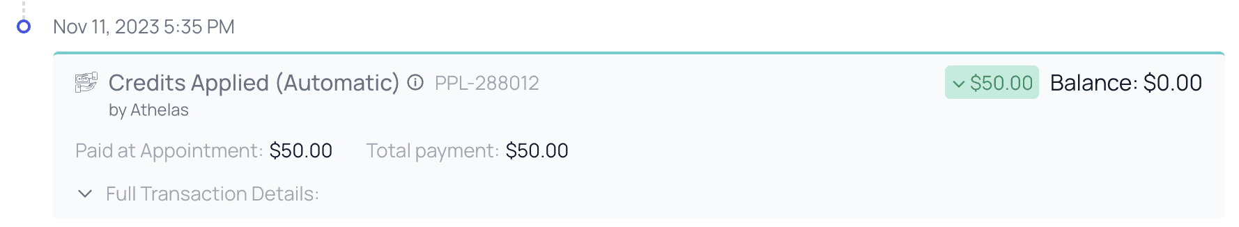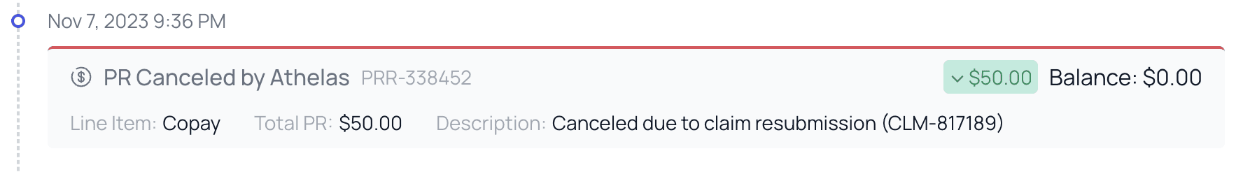 PR Cancellation When a claim has already received a remittance and it is resubmitted, the existing PR attached to the claim will be cancelled while we await a new decision from the payer. (Any payments on the Appointment will be turned into credit, and locked to the date of service). Credits Applied (Automatic) When a patient has credits available, those credits may automatically be applied to new balances as those balances are added to the patient’s account. Patient Statement Sent When statements are delivered, you’ll see that in the timeline as well. Insurance Updated If additional insurance (or changes to insurance) apply to a claim you’ll see them appear at the time the change is made. This is especially important for resubmissions. Write Offs Whenever PR is written off, that will be indicated in the timeline. And that’s just the beginning. As Athelas continues to determine more datapoints that will be helpful in explaining PR we’ll add new cards for increased explainability. Whenever you have questions about a patient’s PR, the PR Timeline can be your best resource, so use it often! Features Supported View PR timeline that shows the user every step that led to the generation of PR