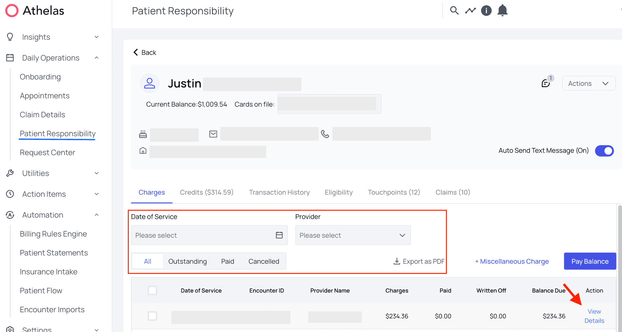 From the Patient Responsibility page, navigate to the Patient View tab and choose a patient. By default you’ll land on the Charges tab. From there, select a date of service from the list and click ‘View Details.’