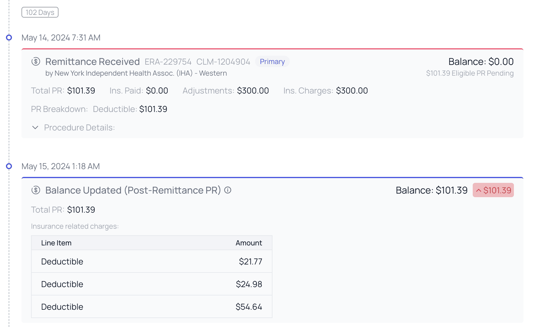 The next day (Jan 12th) Athelas submitted the claim to the payer… But then a surprise: on Feb 1st — 20 days after initial claim submission —an update is needed and the claim is resubmitted. Possibly due to the correction we sent, this claim took an especially long time to process. However on May 14th after 102 days, a remittance was retrieved. The remittance specified a total PR of only $101.39, half of what was originally collected.