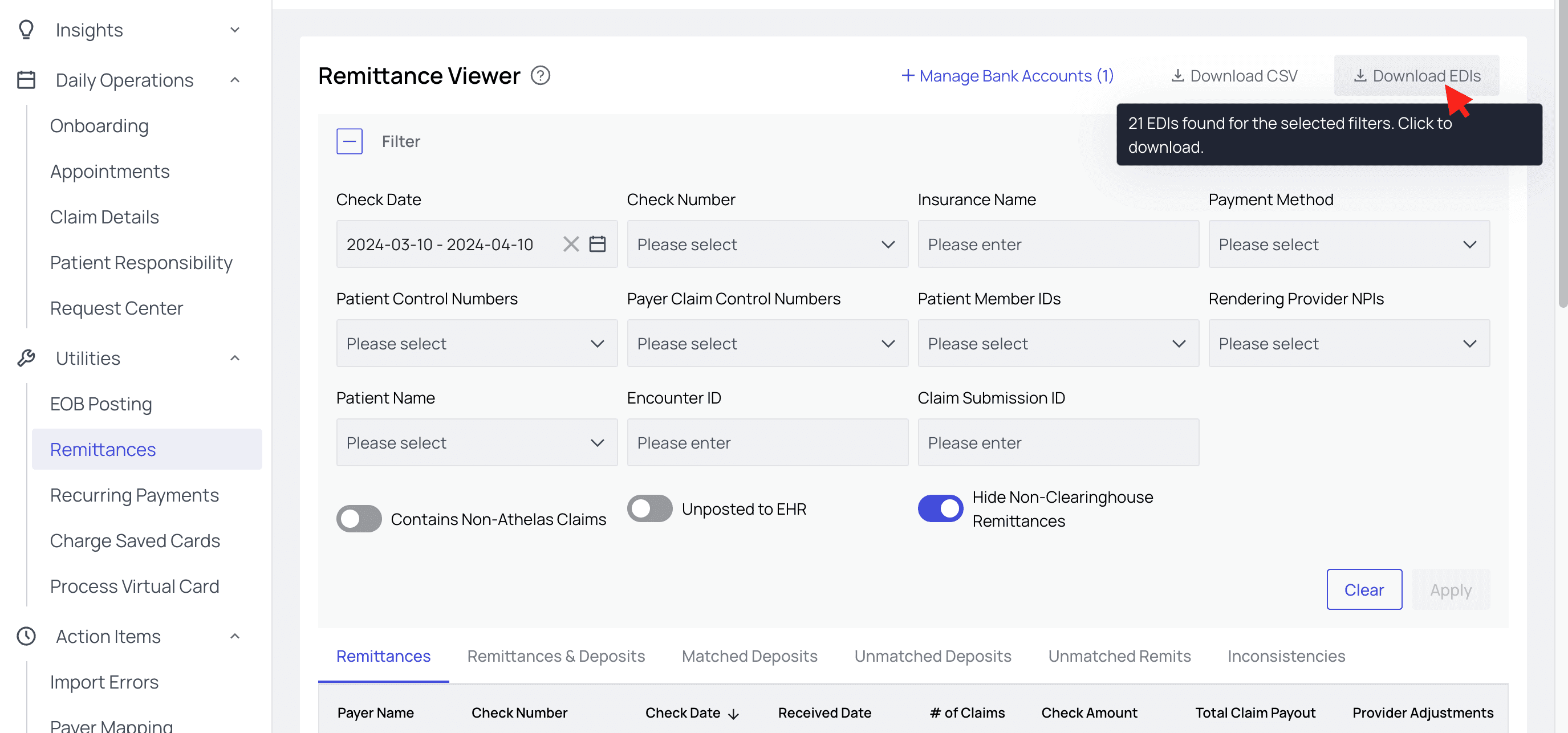 Navigate to the Remittances page. When you’re ready, click Download EDIs. You can use the considerable array of filters to pinpoint the time frame, check number, insurance name, or any other factors you would like. Be sure to click Apply!